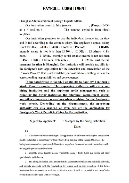 *Only for foreigner who made a payroll commitment (Check the following sample) to the authority when they first-time apply their work permit, such as category A (600K annual salary), category B (400K annual salary), or category B (60 points system) etc., then it is necessary to re-evaluate the qualification of work permit and apply a corresponding modification.